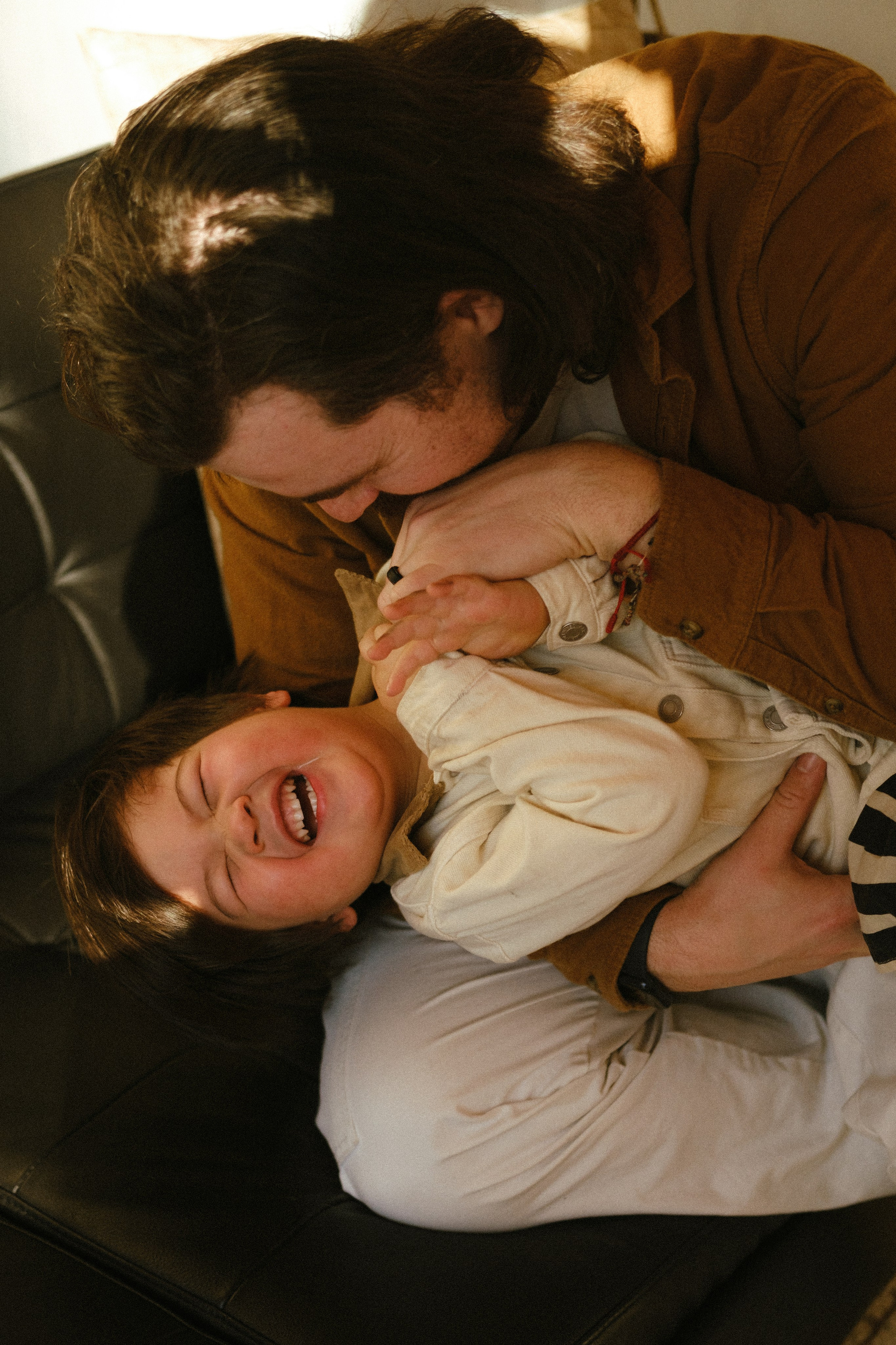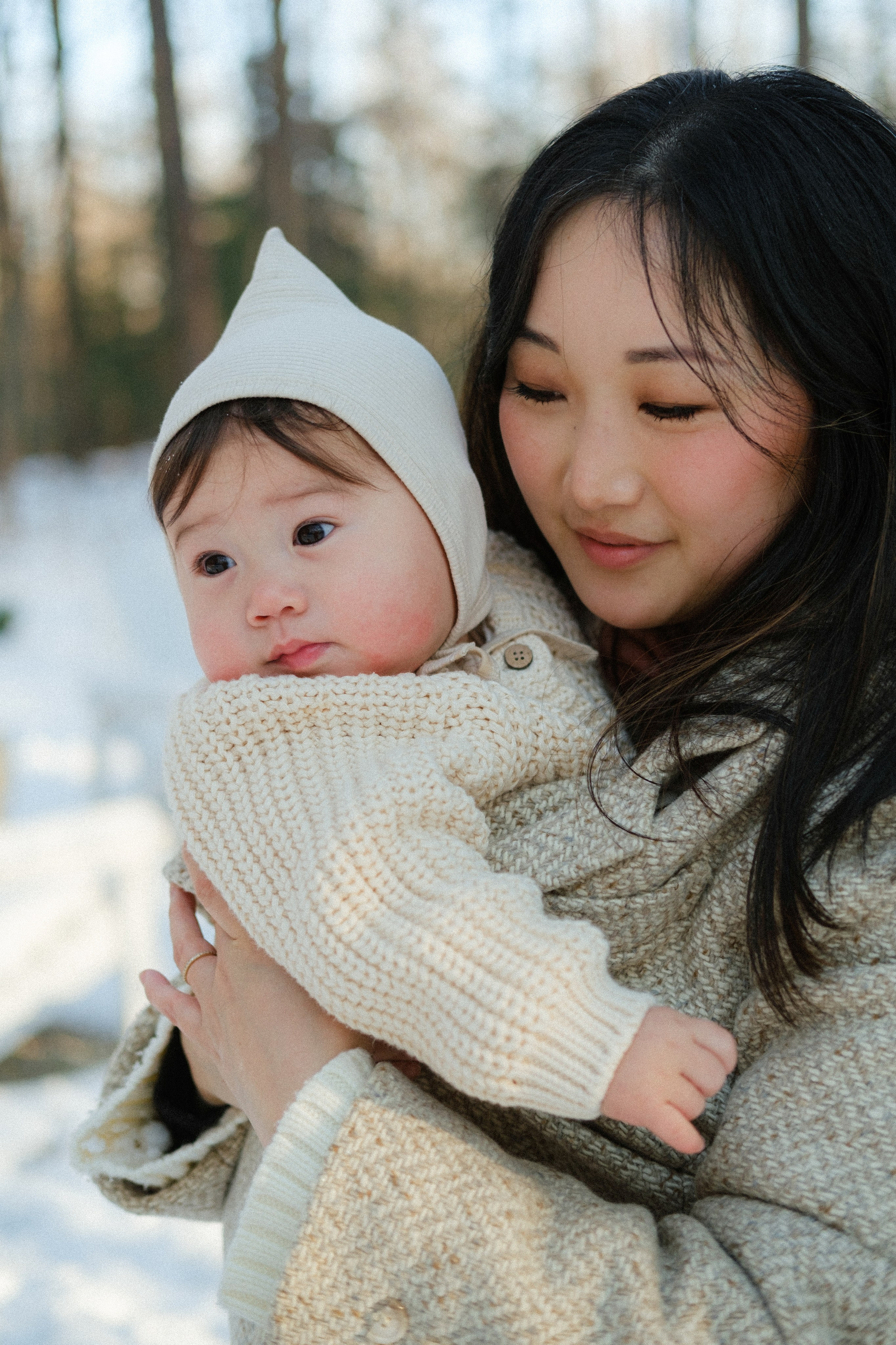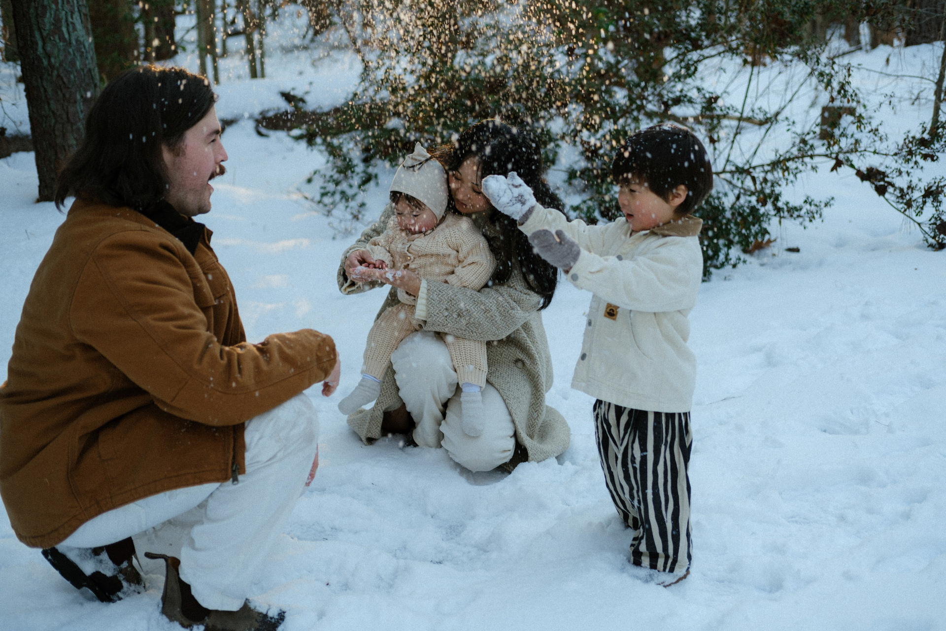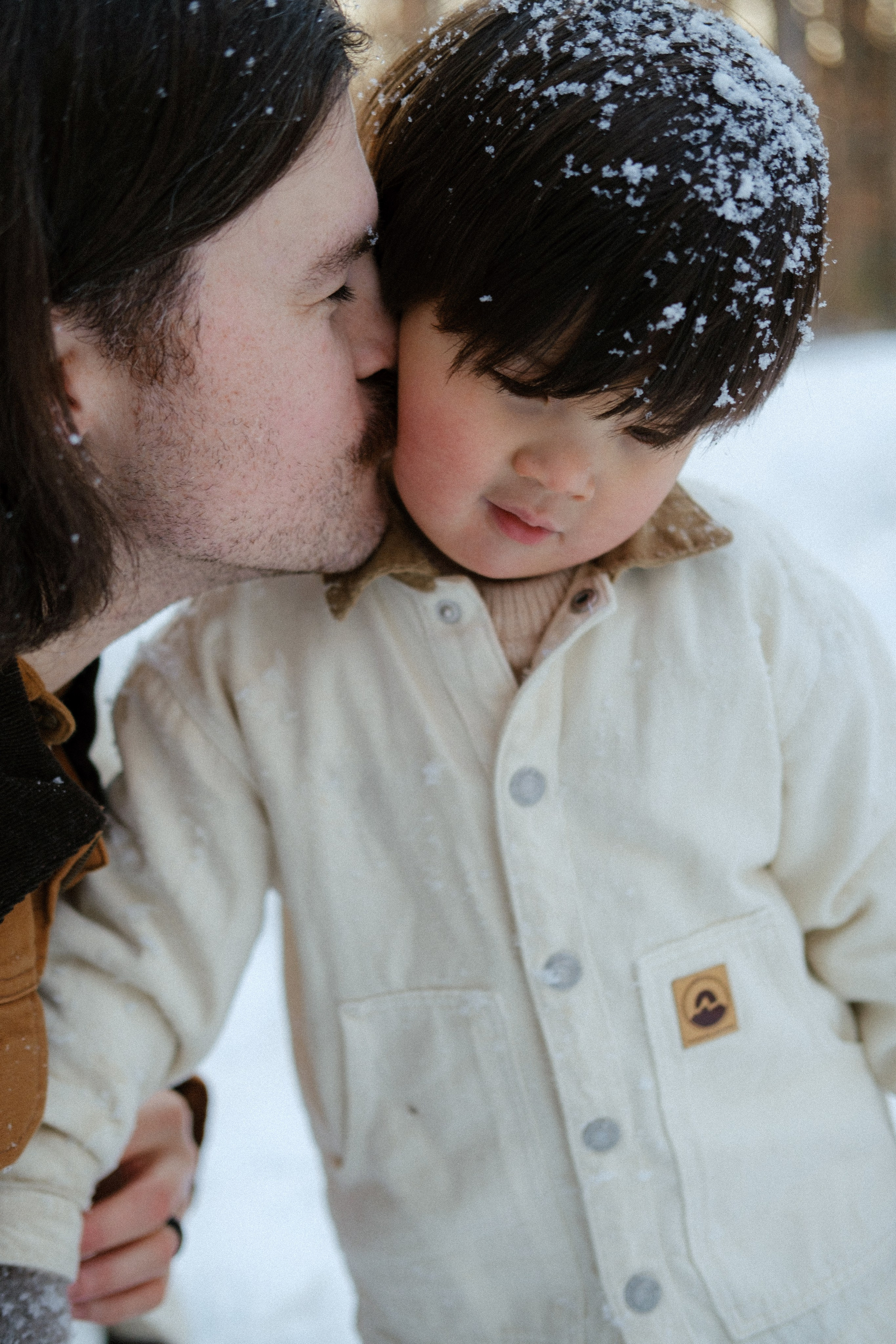 It couldn’t have been more perfect. Picture this: crisp, frosty air, snow blanketing the ground, and a quiet forest where the only sound is birdsong. It’s 3 PM — golden hour — and the house is glowing with the most magical light. It’s cold outside, but inside it’s warm and cozy with the wood stove crackling, thanks to dad. Perfect for snuggles and story time.